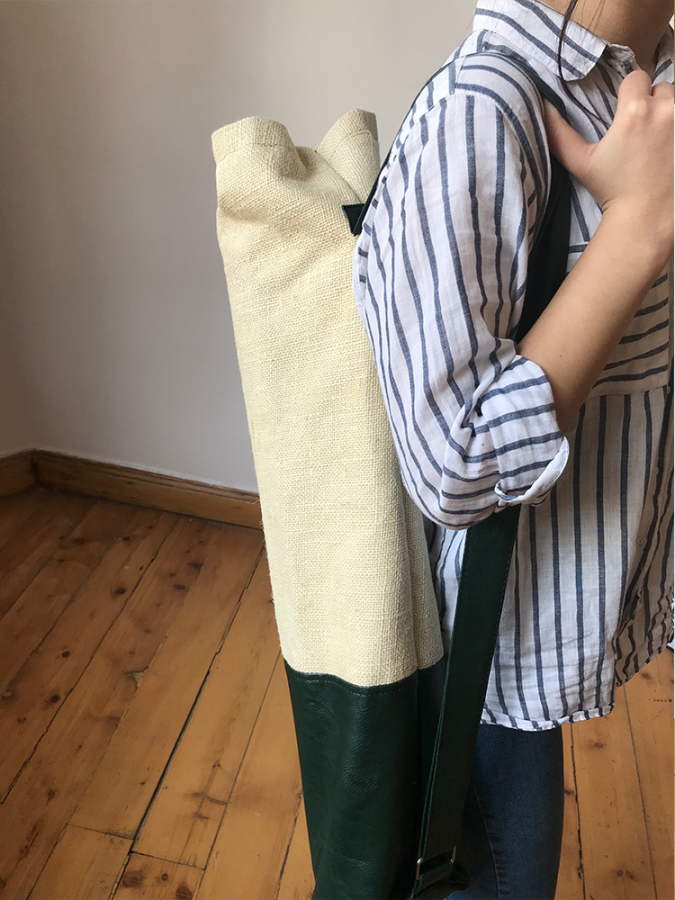 Suni deri ve jüt kumaşlardan el yapımı iç minik cepli mat çantası.